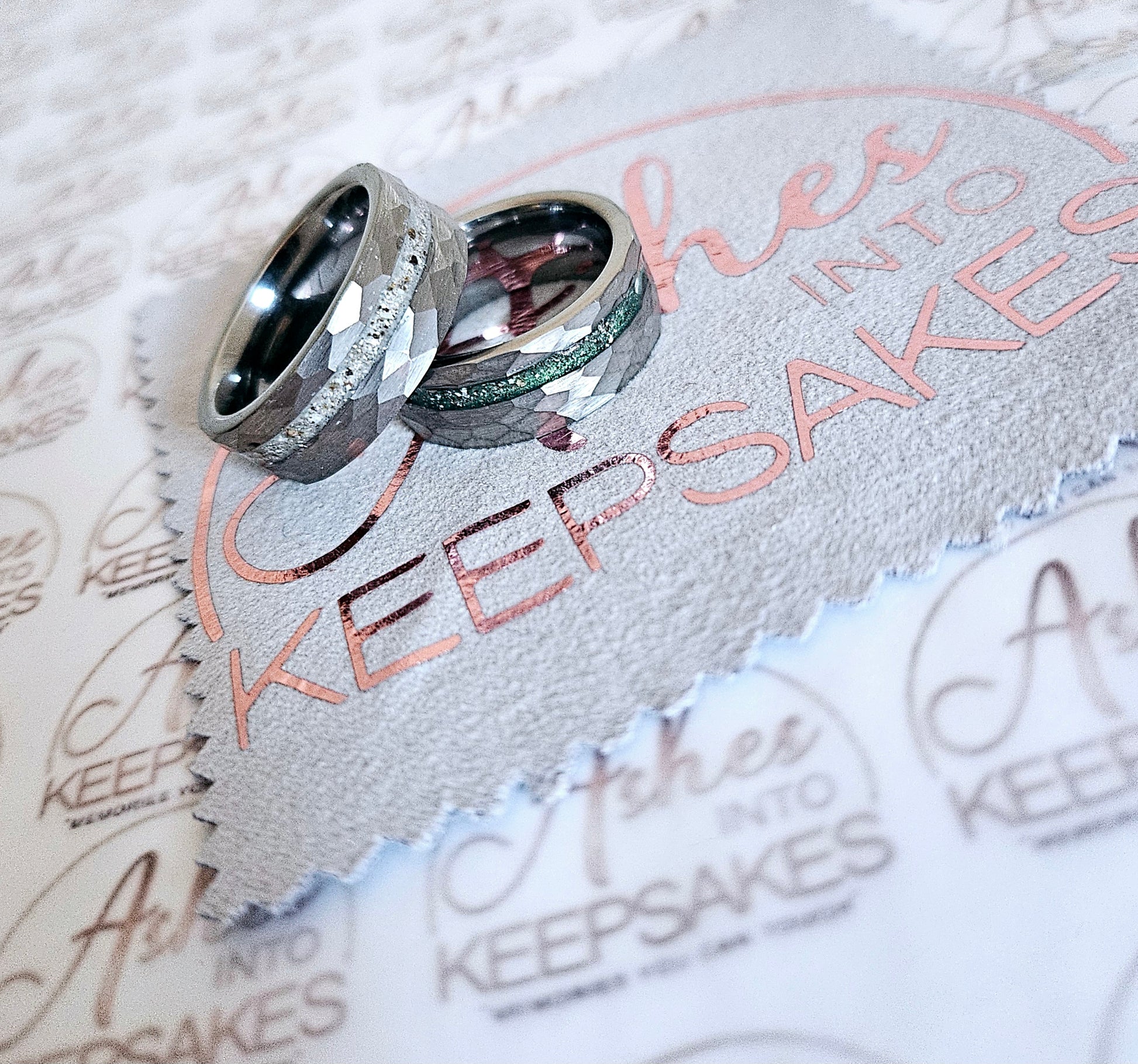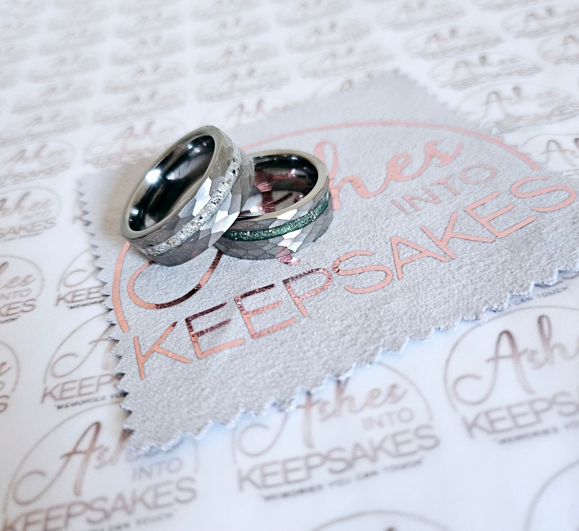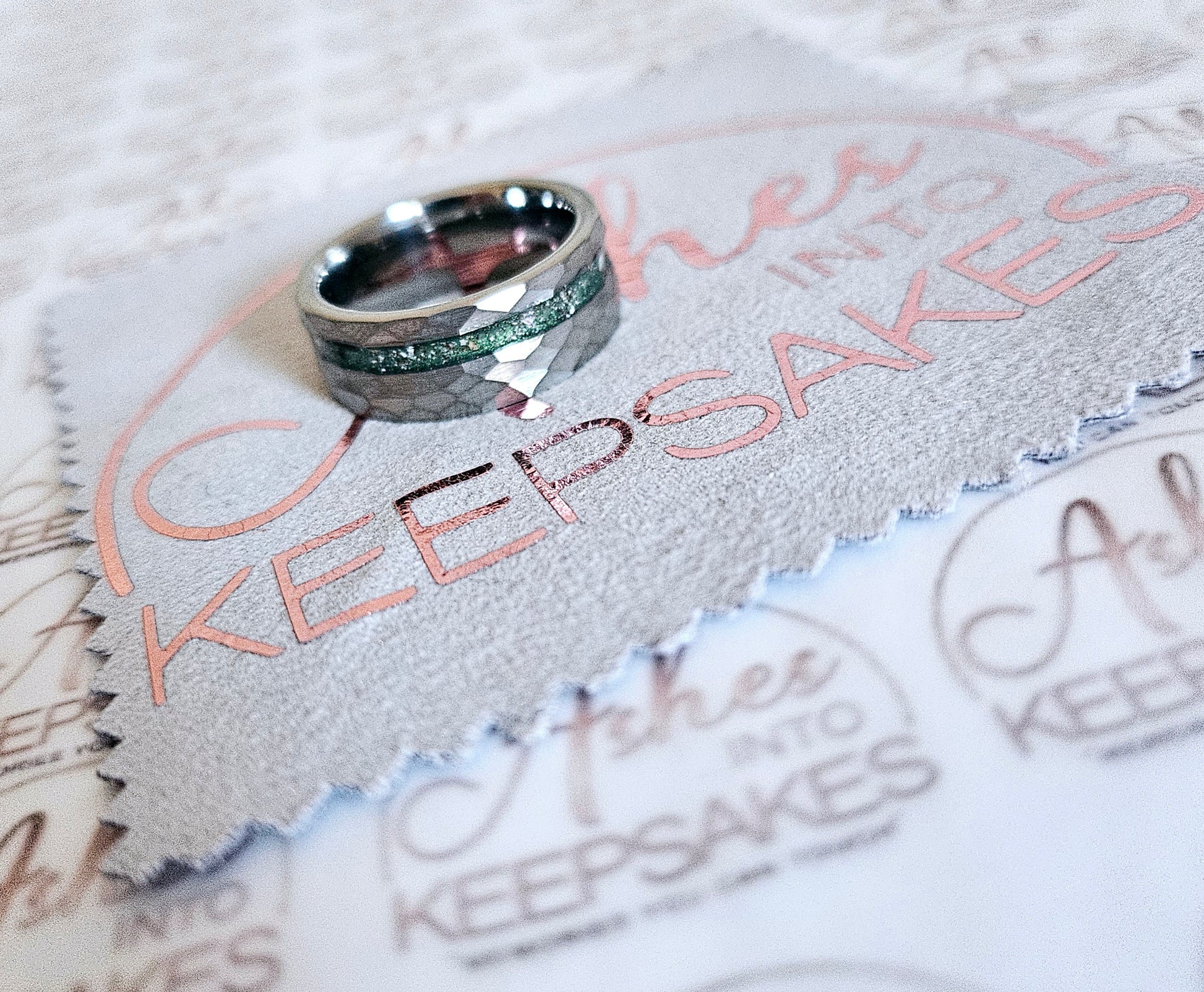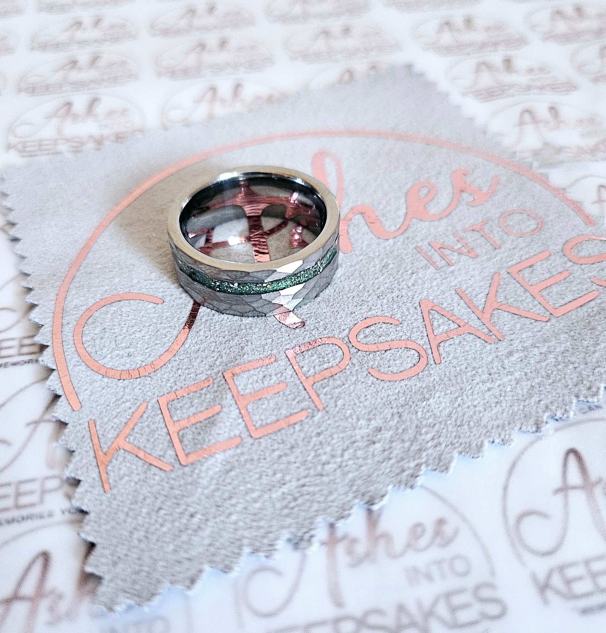 Introducing our memorial ashes Hammered Billy Channel Ring 8mm, a stunning piece of jewelry crafted with precision. This elegant ring features a slim channel that continues around the ring encapsulating loved ones ashes or hair inside. These rings are made of highly durable tungsten carbide and are hardwearing, durable and are hypoallergenic. Can include the ashes and a colour all the way around the band. Comes in a choice of colours and can include your loved ones ashes, hair or pets fur. Add a touch of extra sparkle with the option of real diamond dust added to your jewellery, this is placed in between the layers of the stone and adds a subtle sparkle.