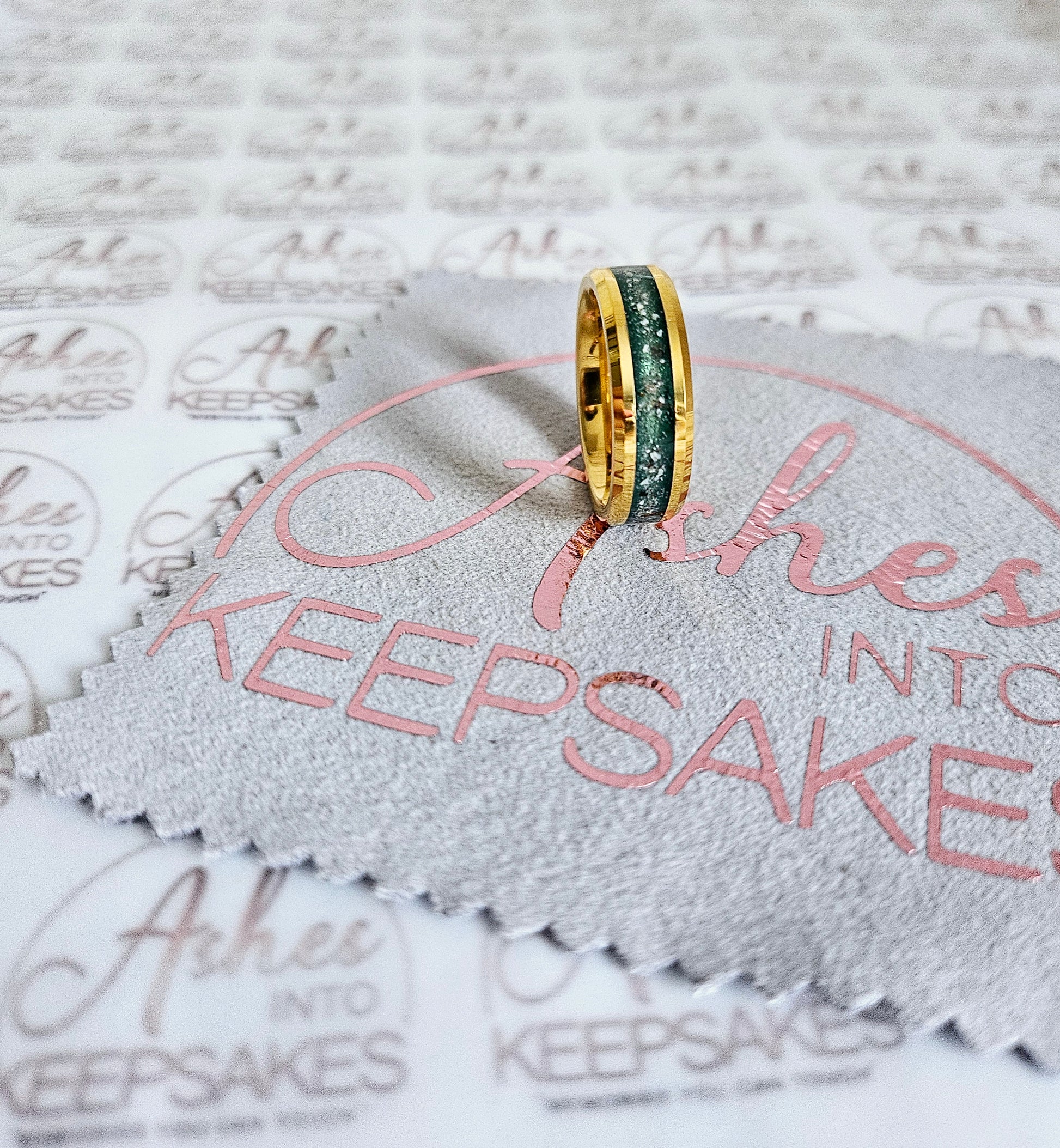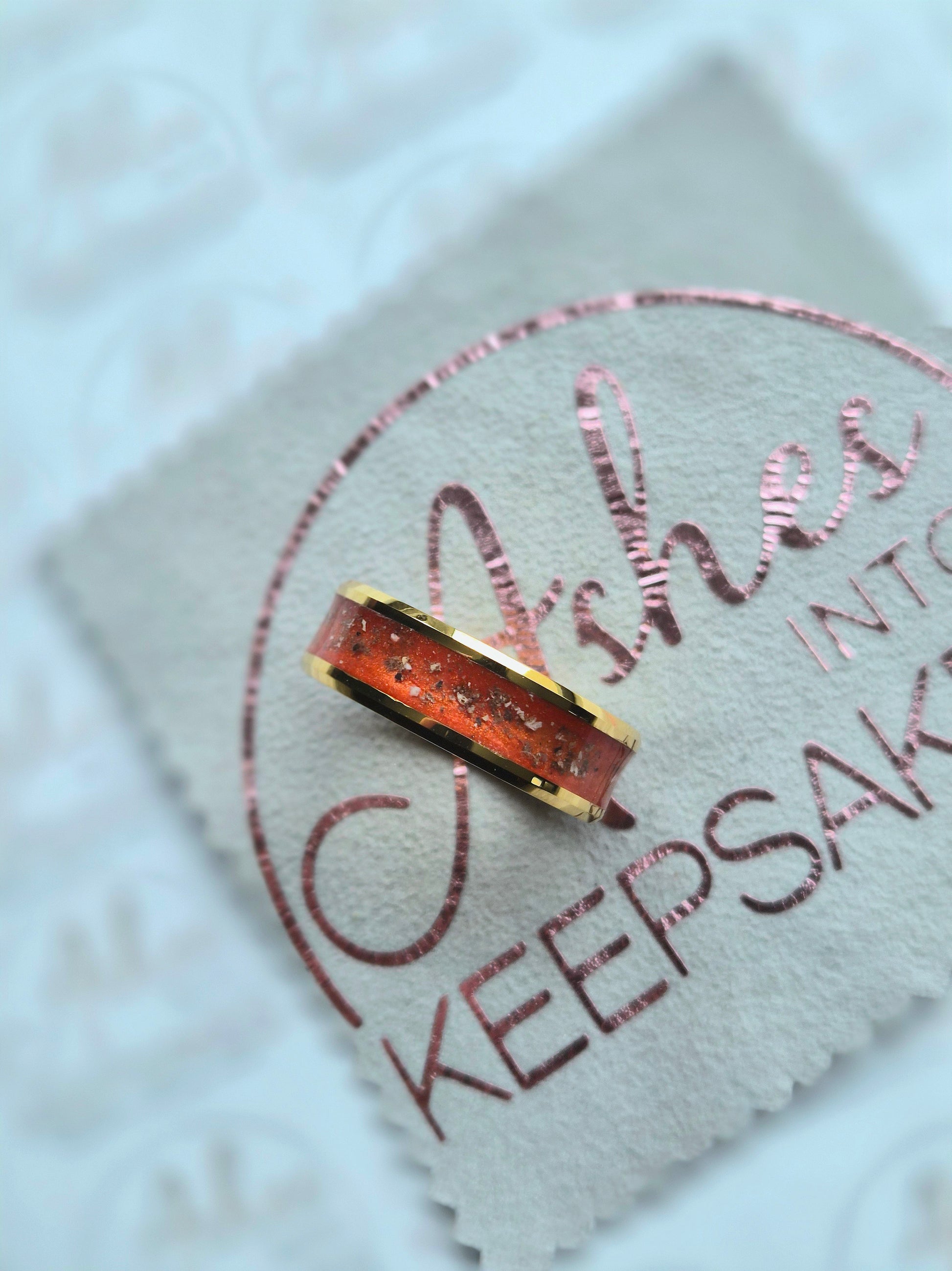 These rings are made from hard wearing and durable tungsten carbide, these are hypoallergenic and can include the ashes and a colour all the way around the band, choice of 6mm or 8mm channel thickness. Comes in a choice of colours and can include your loved ones ashes, hair or pets fur. Add a touch of extra sparkle with the option of real diamond dust added to your jewellery, this is placed in between the layers of the stone and adds a subtle sparkle. Our rings are hand crafted to order and we estimate all orders to take around 3-5 weeks from receiving your loved ones ashes or hair. All items come with authenticity certificate with your loved ones name on. Once you have placed and order with Ashes into keepsakes we will send out a pack for you to send your ashes, hair or pets fur back to us, any unused will be returned to you with your order. The completed product will be expertly buffed to create a mirror shine finish, and due to the range of colours we have to choose from no two resin gems are ever the same. Ashes into keepsakes is committed to each one of our customers to provide the best service and care. Your loved ones ashes, hair or even pets fur will be handled with the utmost respect and care, and any unused will be sealed and returned to you with your order. Your orders will be sent to you with a special authenticity certificate with your loved ones name on and the creation date, then hand signed by our designer.