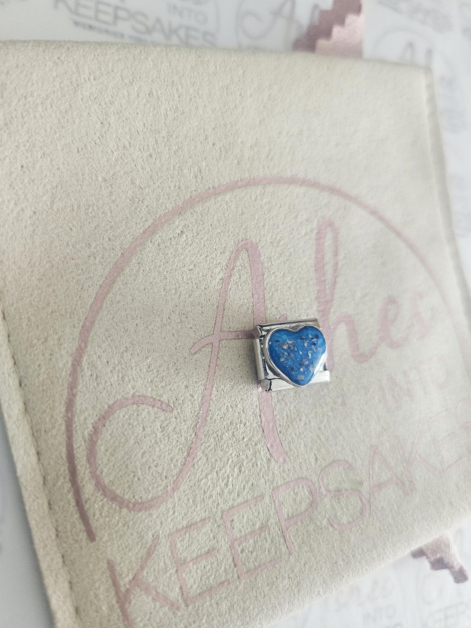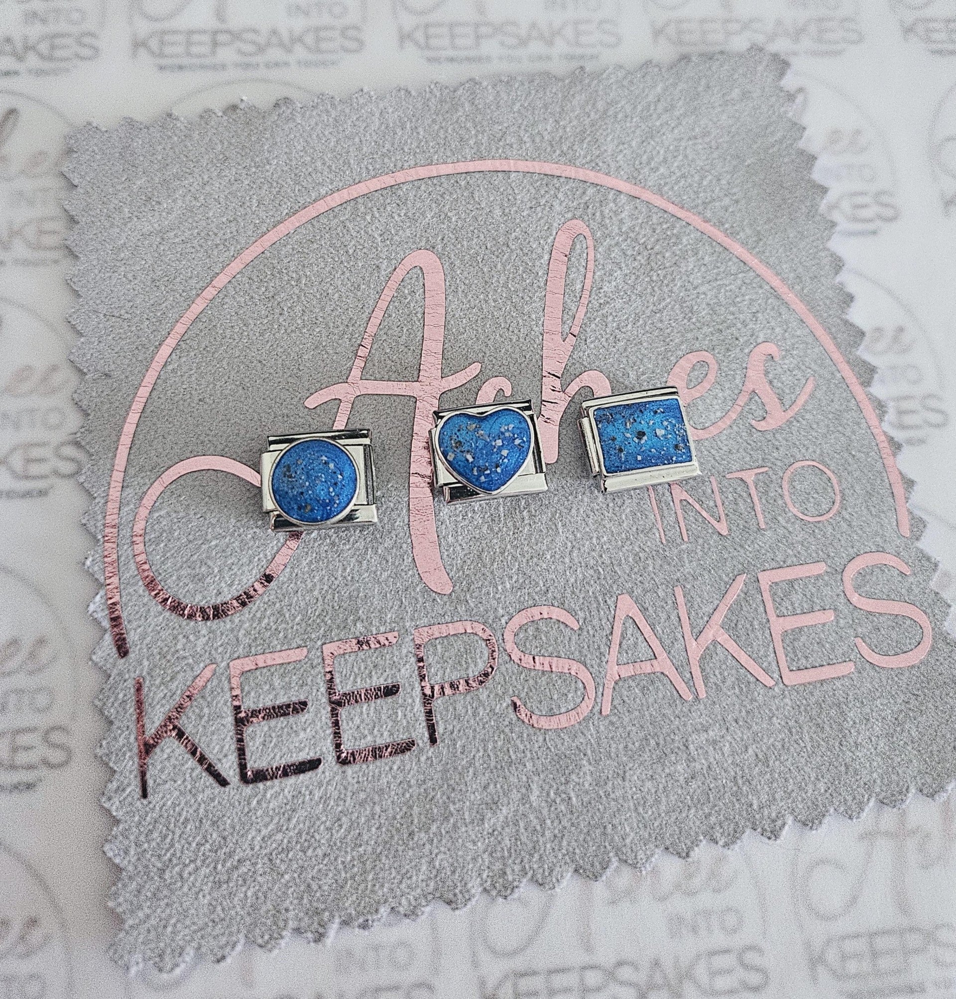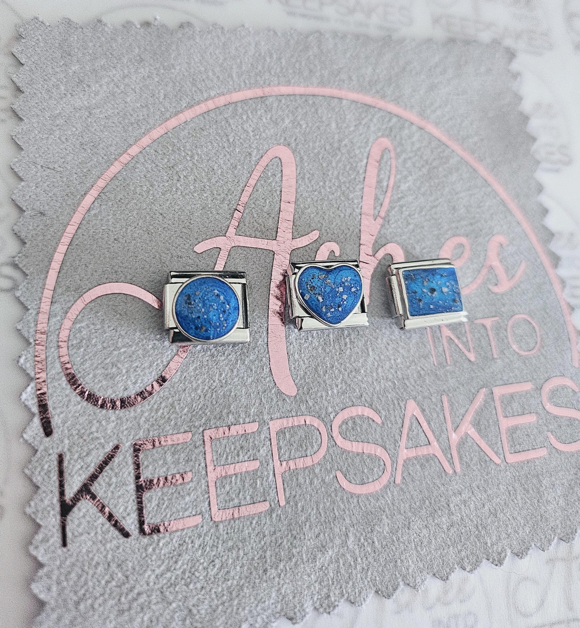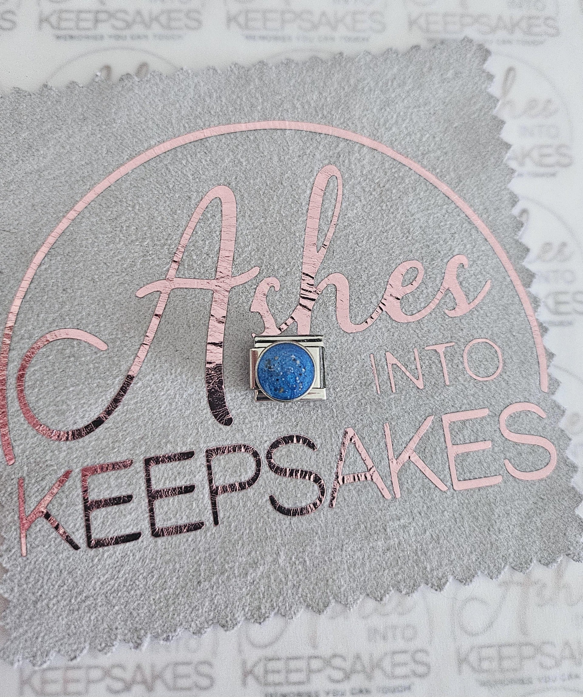 Italian Charms fit nomination bracelets, choice of circle, heart or rectangle. These are simplistic and elegant for everyday wear. Comes in a choice of colours and can include your loved ones ashes, hair or pets fur. Add a touch of extra sparkle with the option of real diamond dust added to your jewellery, this is placed in the top layer of the stone and adds a subtle sparkle. Please note this is the charm only and no bracelet. Each charm is hand crafted to order and we estimate all orders to take around 3-5 weeks from receiving your ashes or hair. All items come with authenticity certificate with your loved ones name on. Once you have placed and order with Ashes into keepsakes we will send out a pack for you to send your ashes, hair or pets fur back to us, any unused will be returned to you with your order. The completed product will be expertly buffed to create a mirror shine finish, and due to the range of colours we have to choose from no two resin gems are ever the same. Ashes into keepsakes is committed to each one of our customers to provide the best service and care. Your loved ones ashes, hair or even pets fur will be handled with the utmost respect and care, and any unused will be sealed and returned to you with your order.