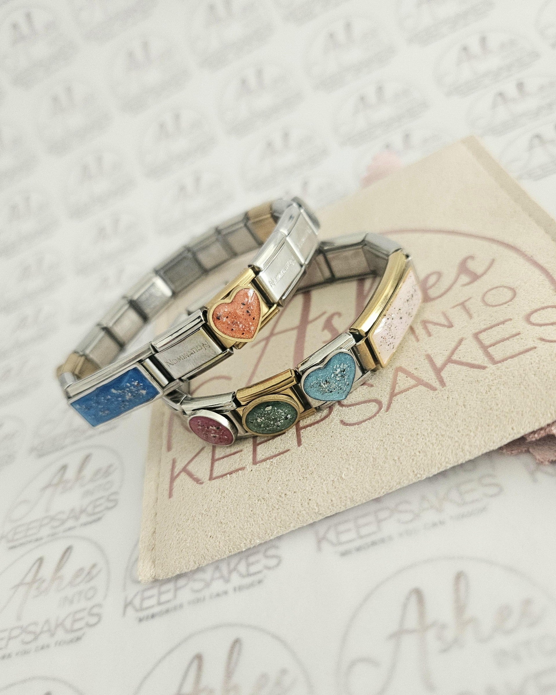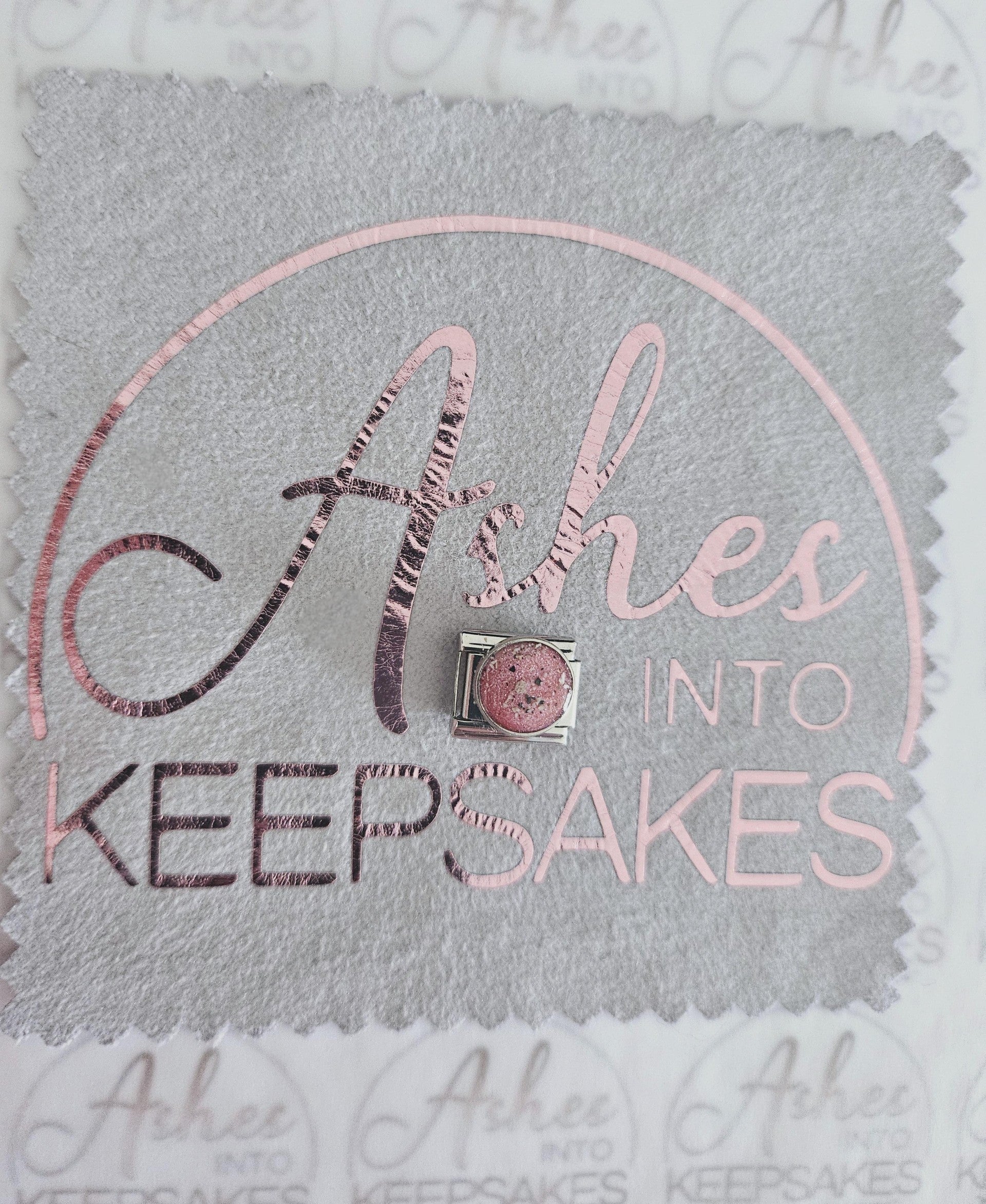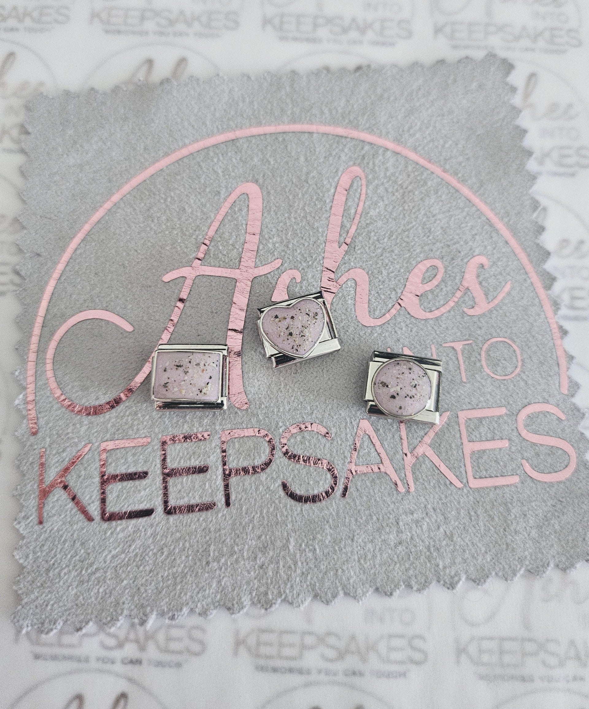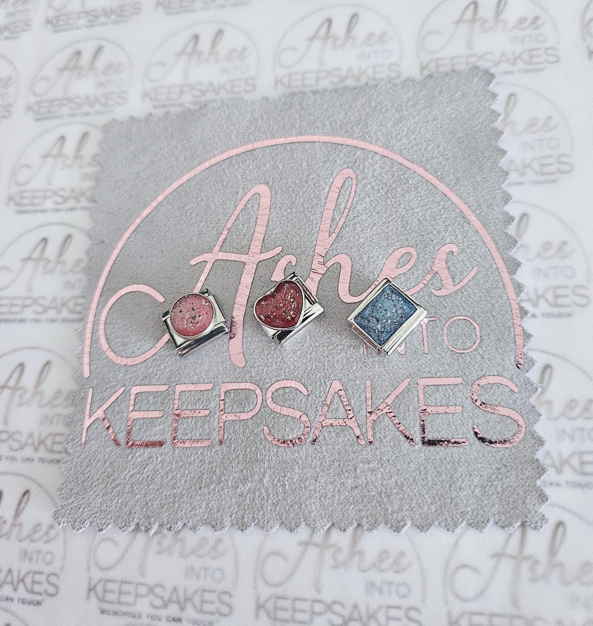 Italian Charms fit nomination bracelets, choice of circle, heart or rectangle. These are simplistic and elegant for everyday wear. Comes in a choice of colours and can include your loved ones ashes, hair or pets fur. Add a touch of extra sparkle with the option of real diamond dust added to your jewellery, this is placed in the top layer of the stone and adds a subtle sparkle. Please note this is the charm only and no bracelet. Each charm is hand crafted to order and we estimate all orders to take around 3-5 weeks from receiving your ashes or hair. All items come with authenticity certificate with your loved ones name on. Once you have placed and order with Ashes into keepsakes we will send out a pack for you to send your ashes, hair or pets fur back to us, any unused will be returned to you with your order. The completed product will be expertly buffed to create a mirror shine finish, and due to the range of colours we have to choose from no two resin gems are ever the same. Ashes into keepsakes is committed to each one of our customers to provide the best service and care. Your loved ones ashes, hair or even pets fur will be handled with the utmost respect and care, and any unused will be sealed and returned to you with your order.
