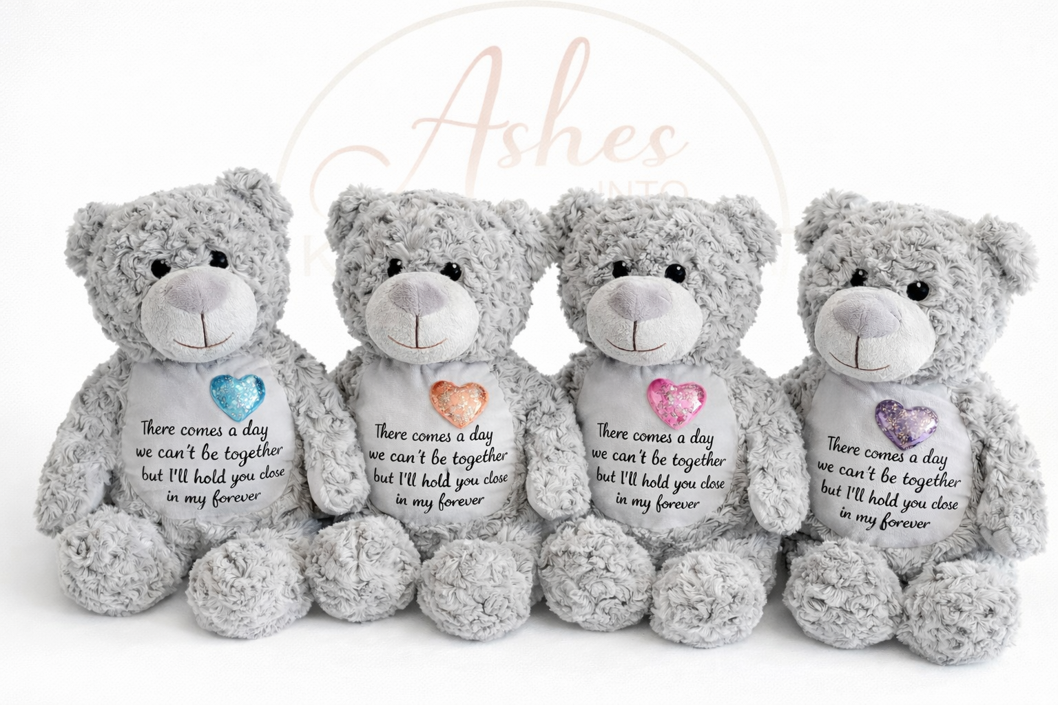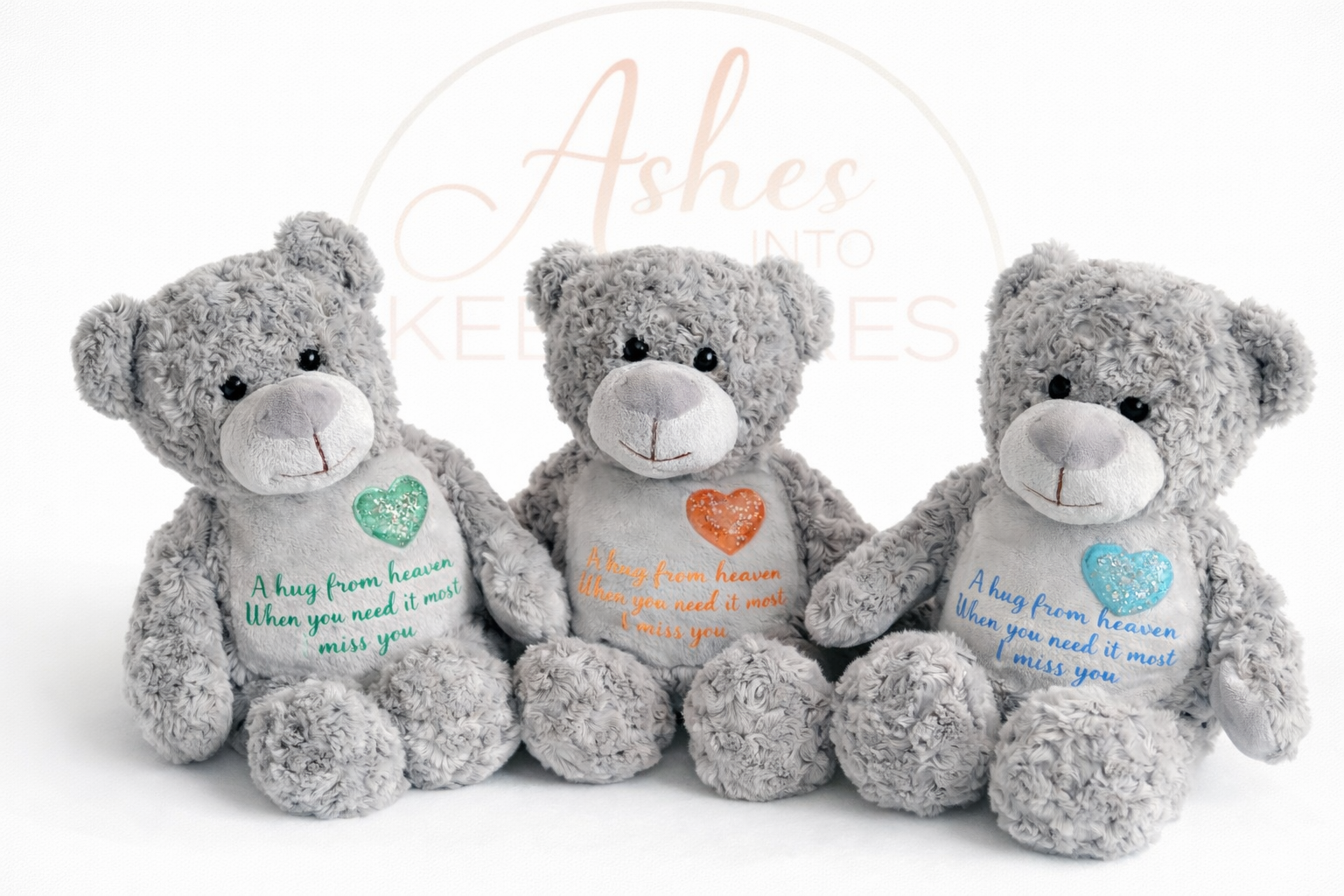 Introducing our exquisite Memory Bear collection, these beautiful bears come in a wide range of styles and colours. With a beautifully crafted heart including loved ones ashes or hair inside. Option of personalised draw string bag can also be added on to your order. Brown bear can have small personalisation on ears such as a heart or initials, grey and cream bear can have small personalisation on hands. We also do memory bunnys with the option of personalisation on tummy and ears.