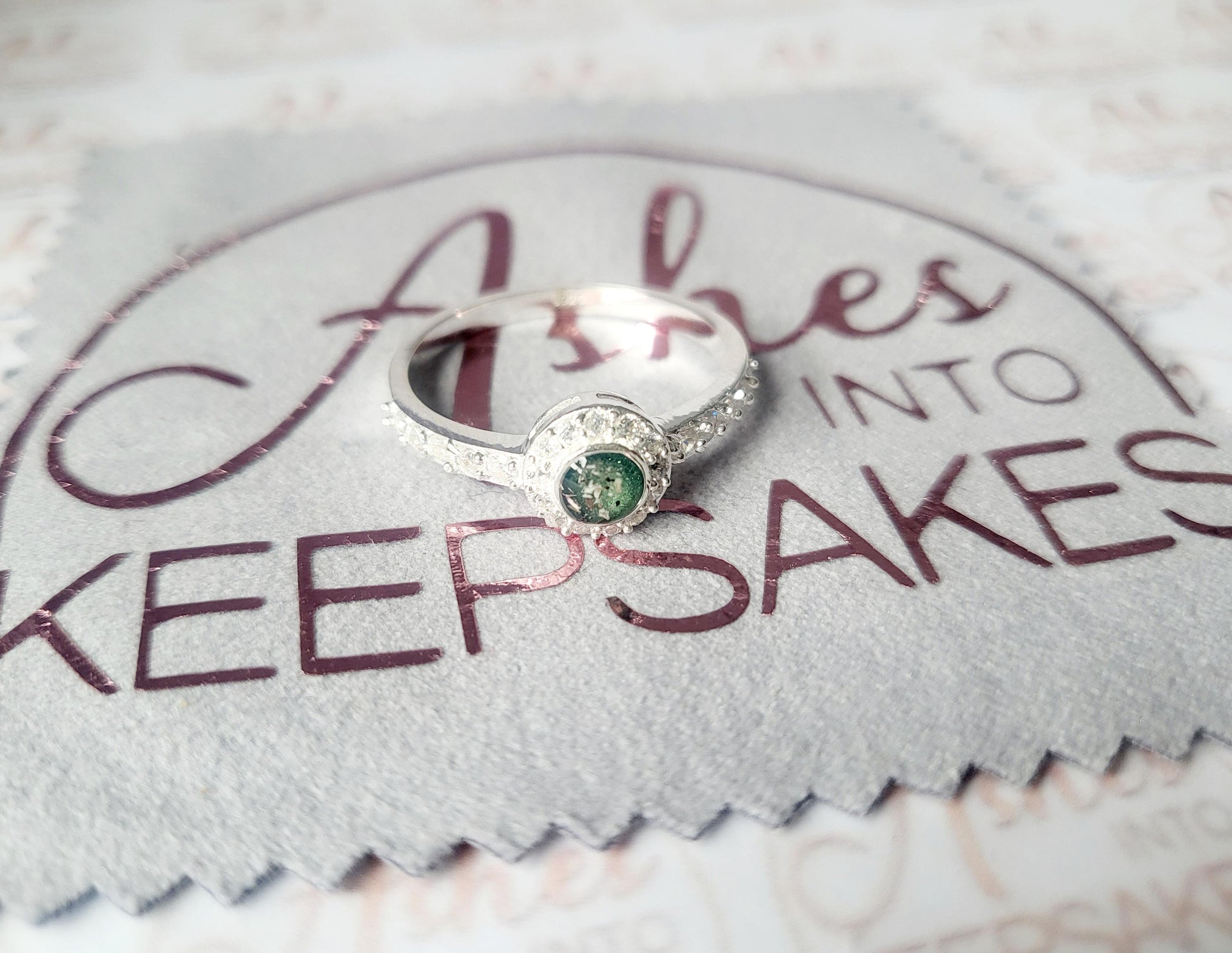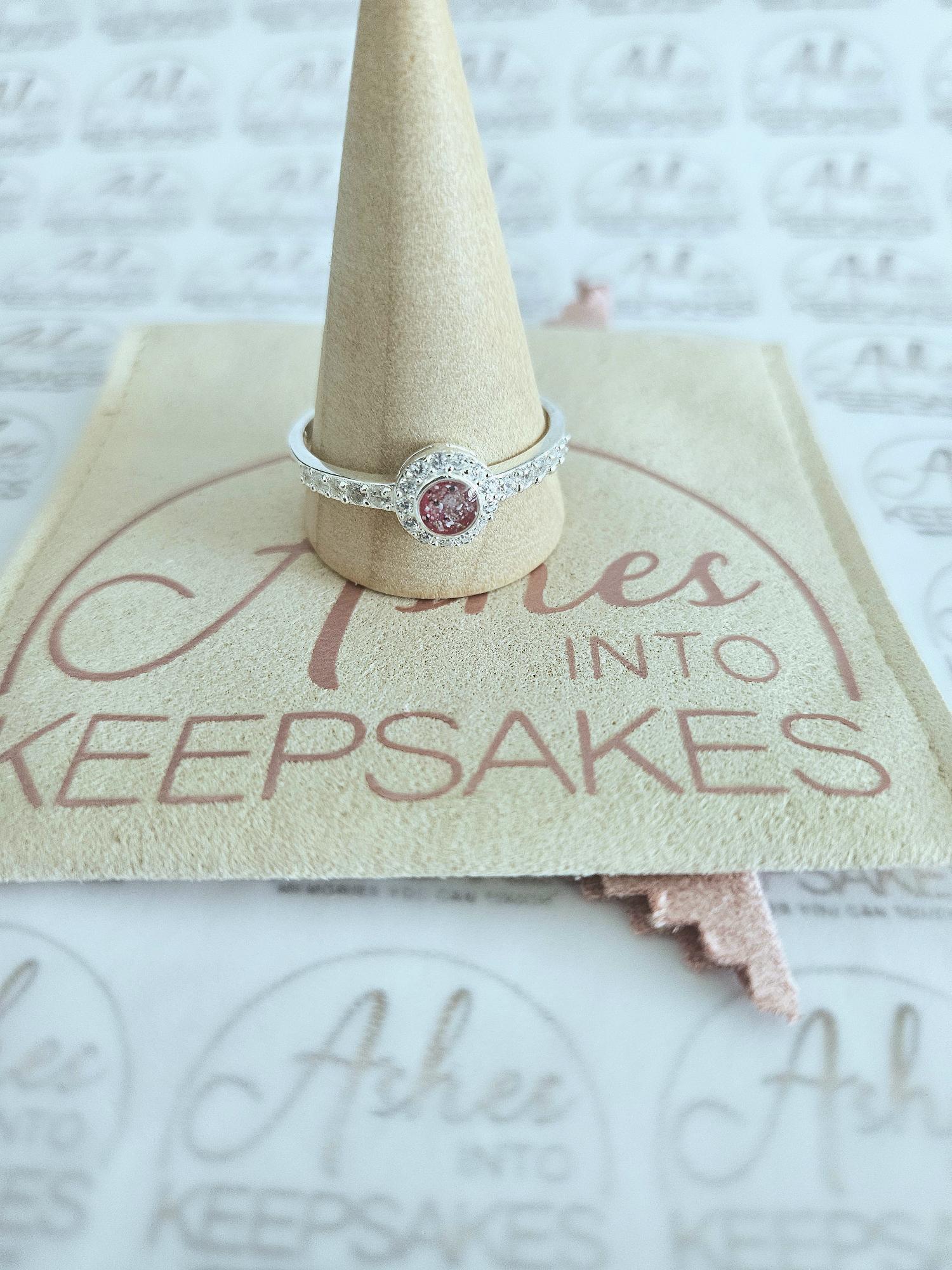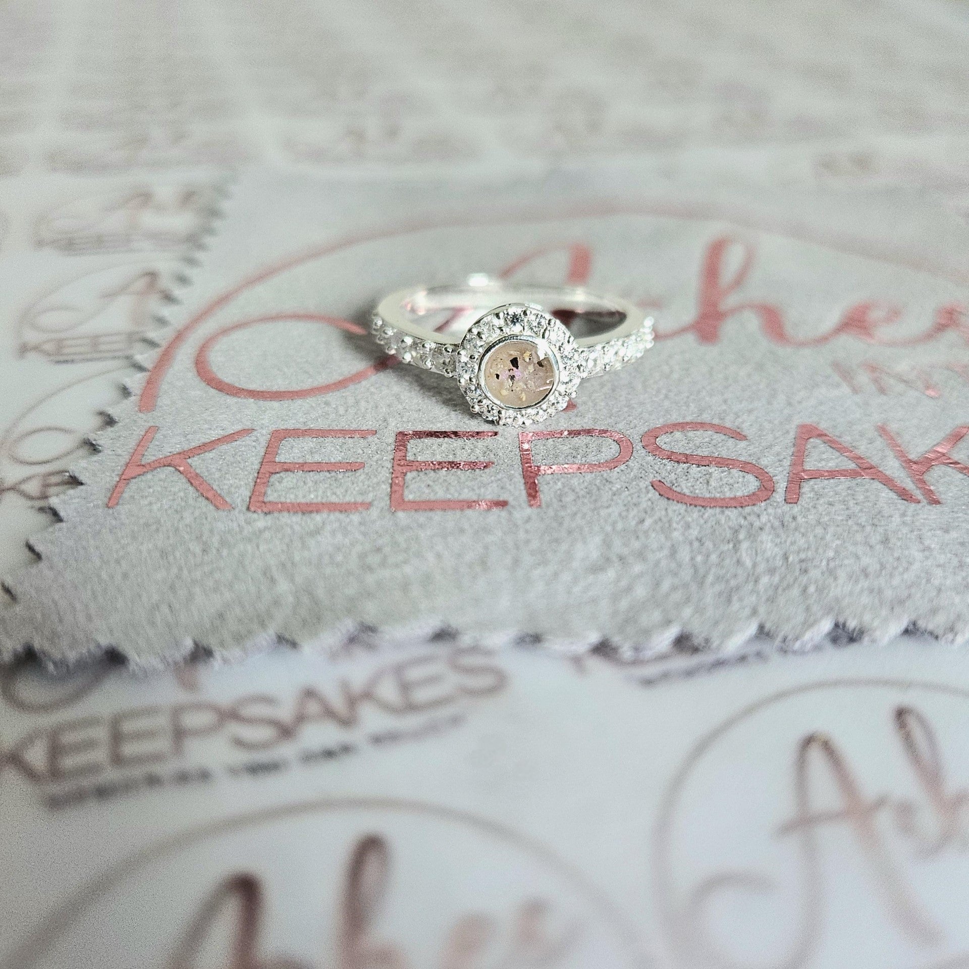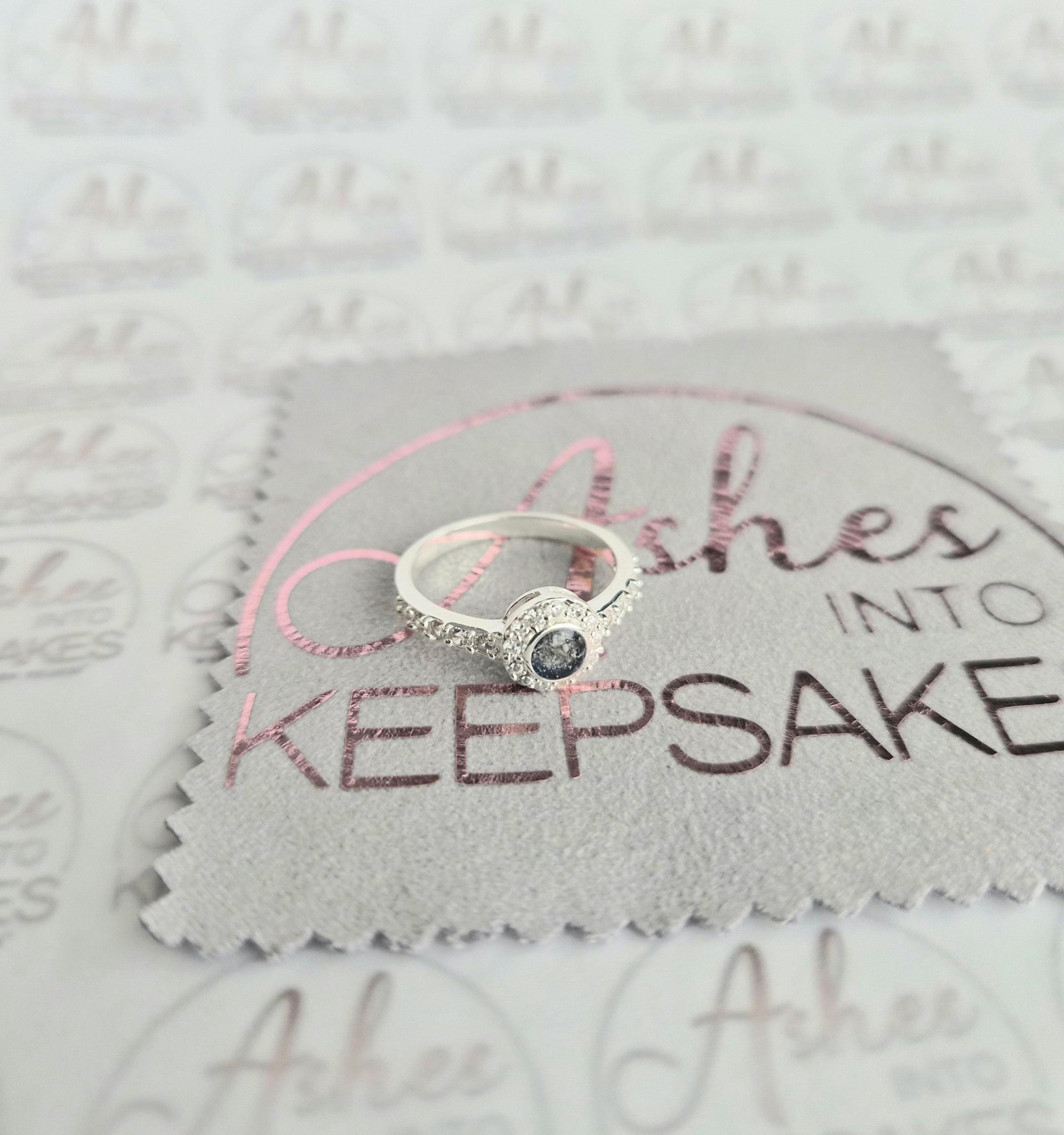 Introducing the exquisite memorial Primrose Ring, for your loved ones cremation ashes or hair to be encapsulated inside with your choice of coloured stone, a timeless piece of jewelry that effortlessly combines elegance and sophistication. Crafted with utmost precision, this stunning ring features an open design encasing a central stone with cubic zirconia. These are made of sterling silver and are truly pleasing to the eye, we also offer the matching pendant separate. Comes in a choice of colours and can include your loved ones ashes, hair or pets fur. Add a touch of extra sparkle with the option of real diamond dust added to your jewellery, this is placed in between the layers of the stone and adds a subtle sparkle. Each ring is hand crafted to order and we estimate all orders to take around 3-5 weeks. All items come with authenticity certificate with your loved ones name on. Once you have placed and order with Ashes into keepsakes we will send out a pack for you to send your ashes, hair or pets fur back to us, any unused will be returned to you with your order. Please note if you are requesting a ring sizer, this could delay your order slightly whilst we are awaiting confirmation of your size.