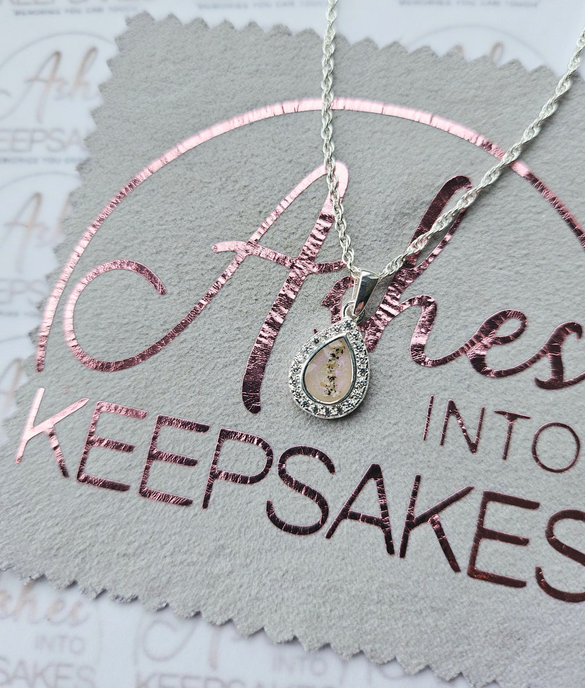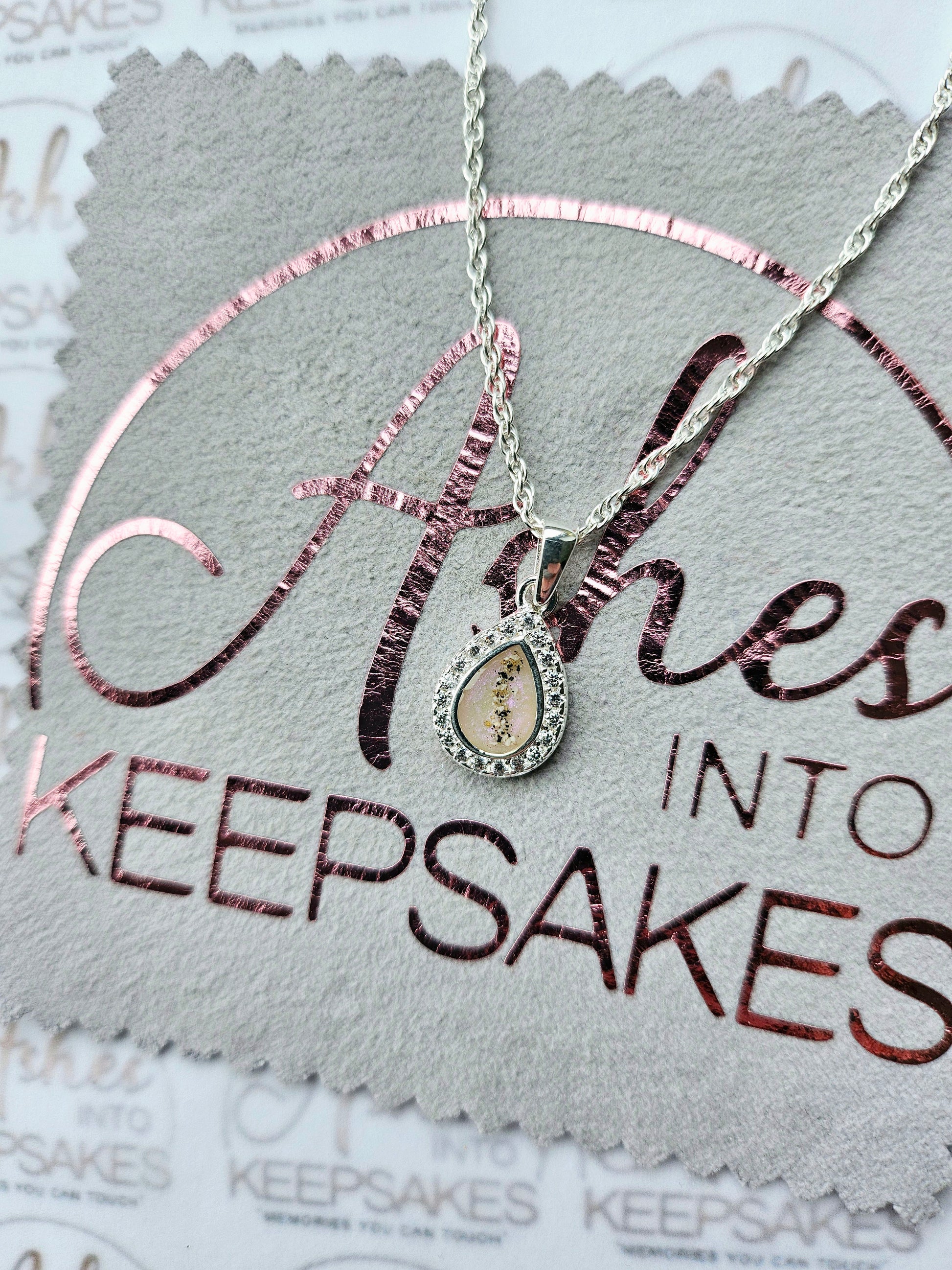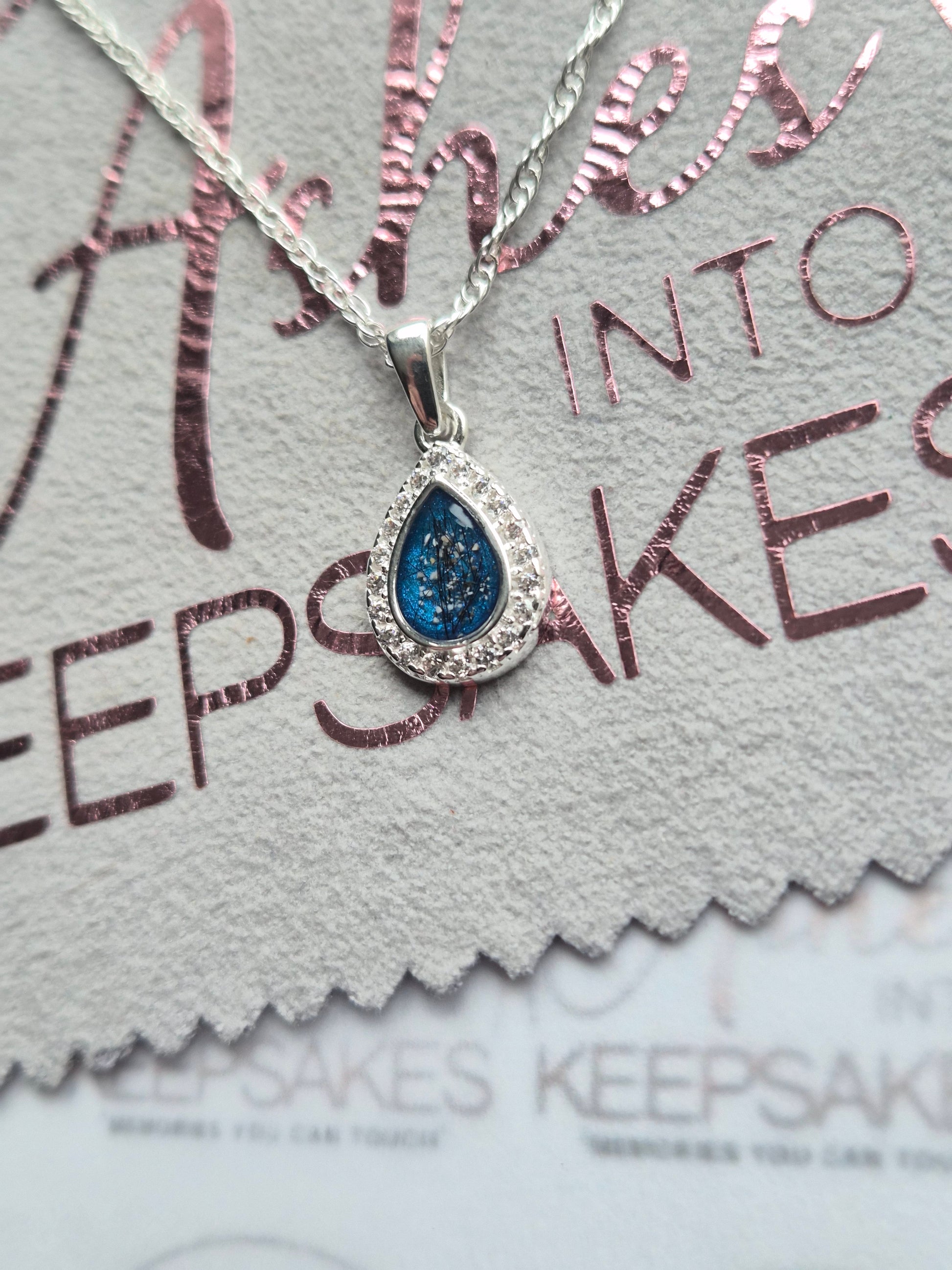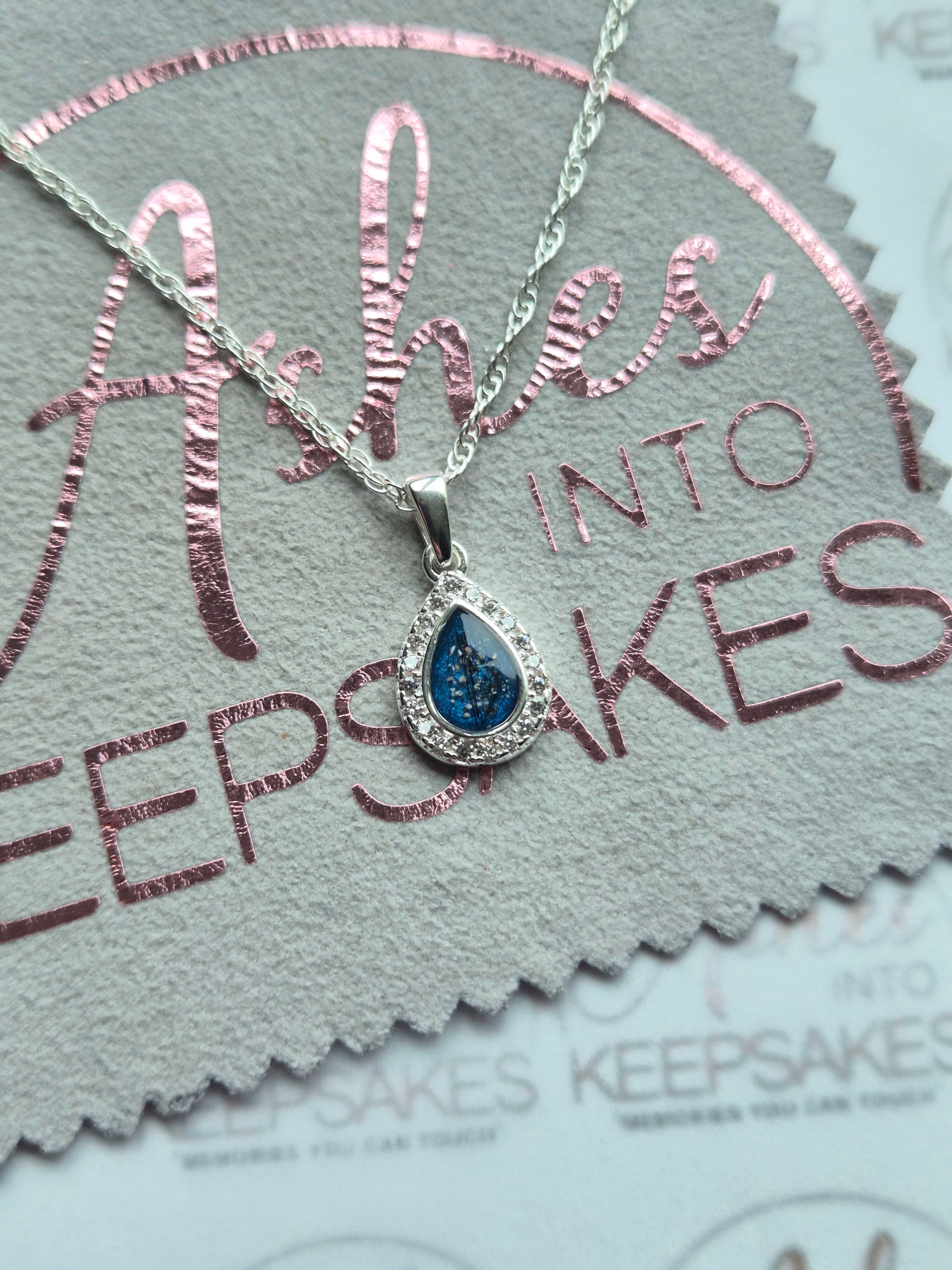 Sterling silver memorial pear pendant with cz around the pear giving this so much sparkle. For cremation ashes or hair these are stunning for everyday wear keeping loved ones close. This is for the pendant and chain only the matching ring can be purchased for an extra cost. Comes in a choice of colours and can include your loved ones ashes, hair or pets fur. Add a touch of extra sparkle with the option of real diamond dust added to your jewellery, this is placed in between the layers of the stone and adds a subtle sparkle. Each pendant is hand crafted to order and we estimate all orders to take around 3-5 weeks. All items come with authenticity certificate with your loved ones name on. Once you have placed and order with Ashes into keepsakes we will send out a pack for you to send your ashes, hair or pets fur back to us, any unused will be returned to you with your order. The completed product will be expertly buffed to create a mirror shine finish, and due to the range of colours we have to choose from no two resin gems are ever the same. Ashes into keepsakes is committed to each one of our customers to provide the best service and care. Your loved ones ashes, hair or even pets fur will be handled with the utmost respect and care, and any unused will be sealed and returned to you with your order.