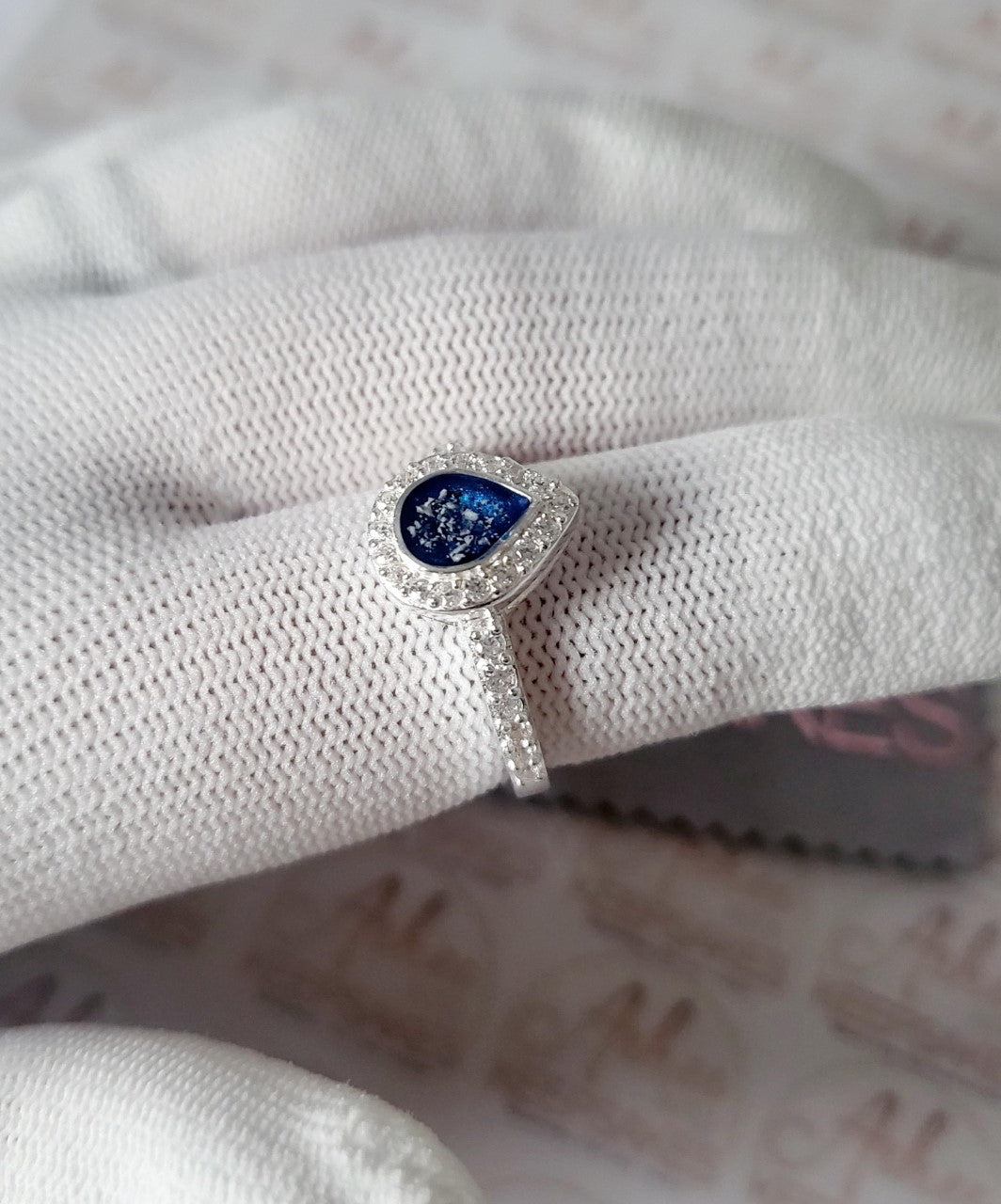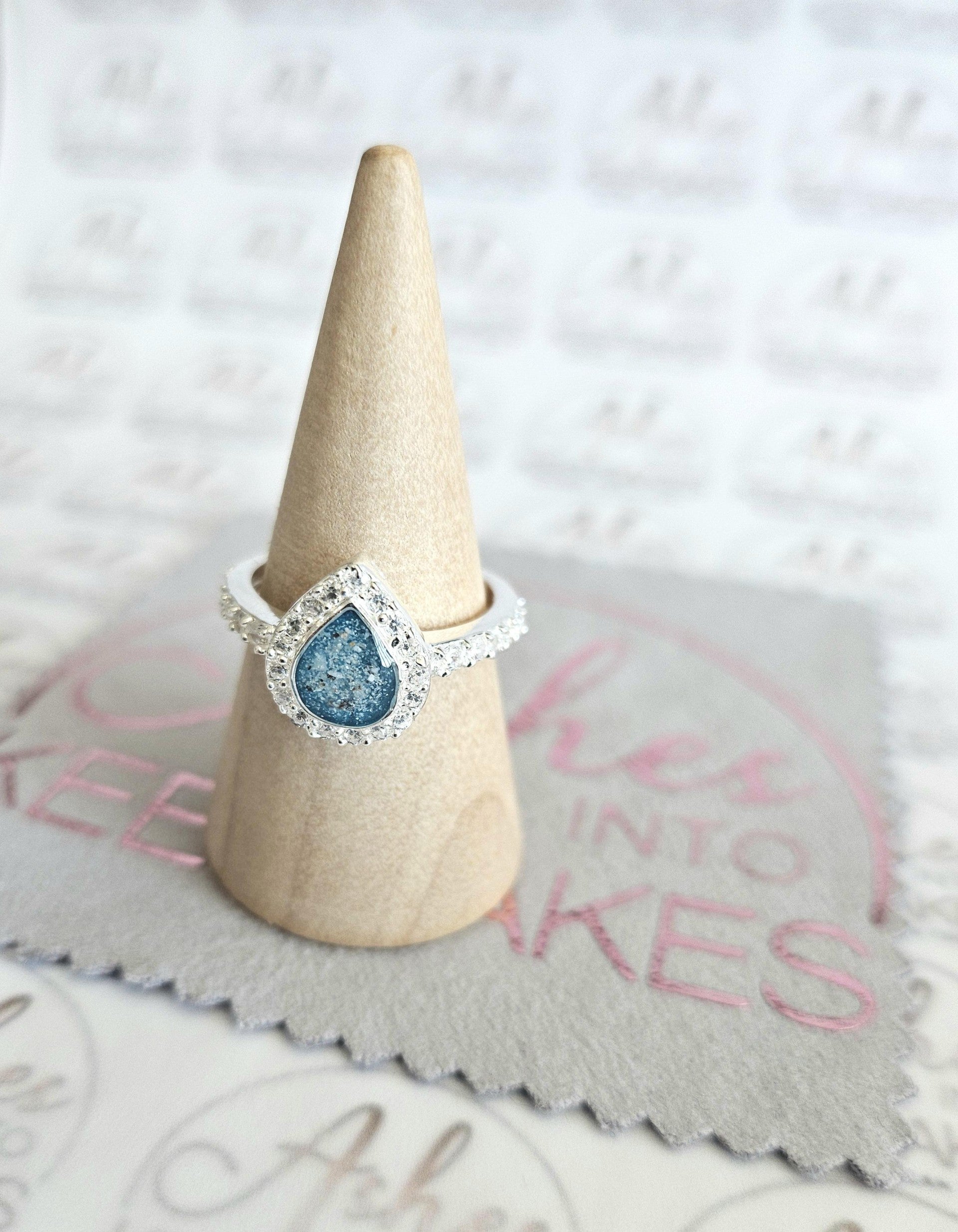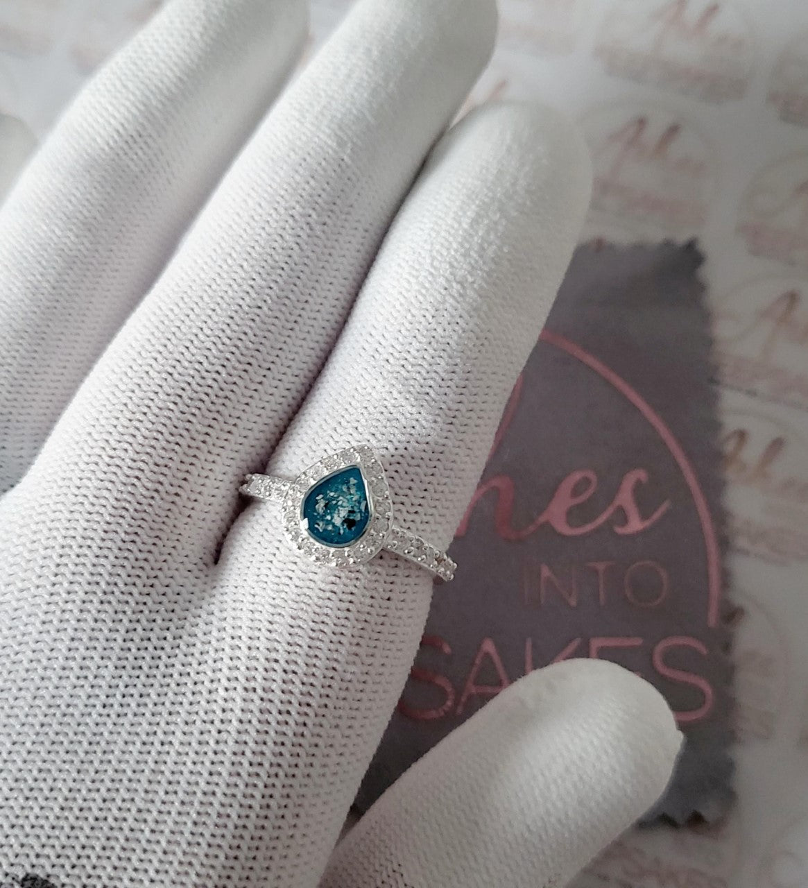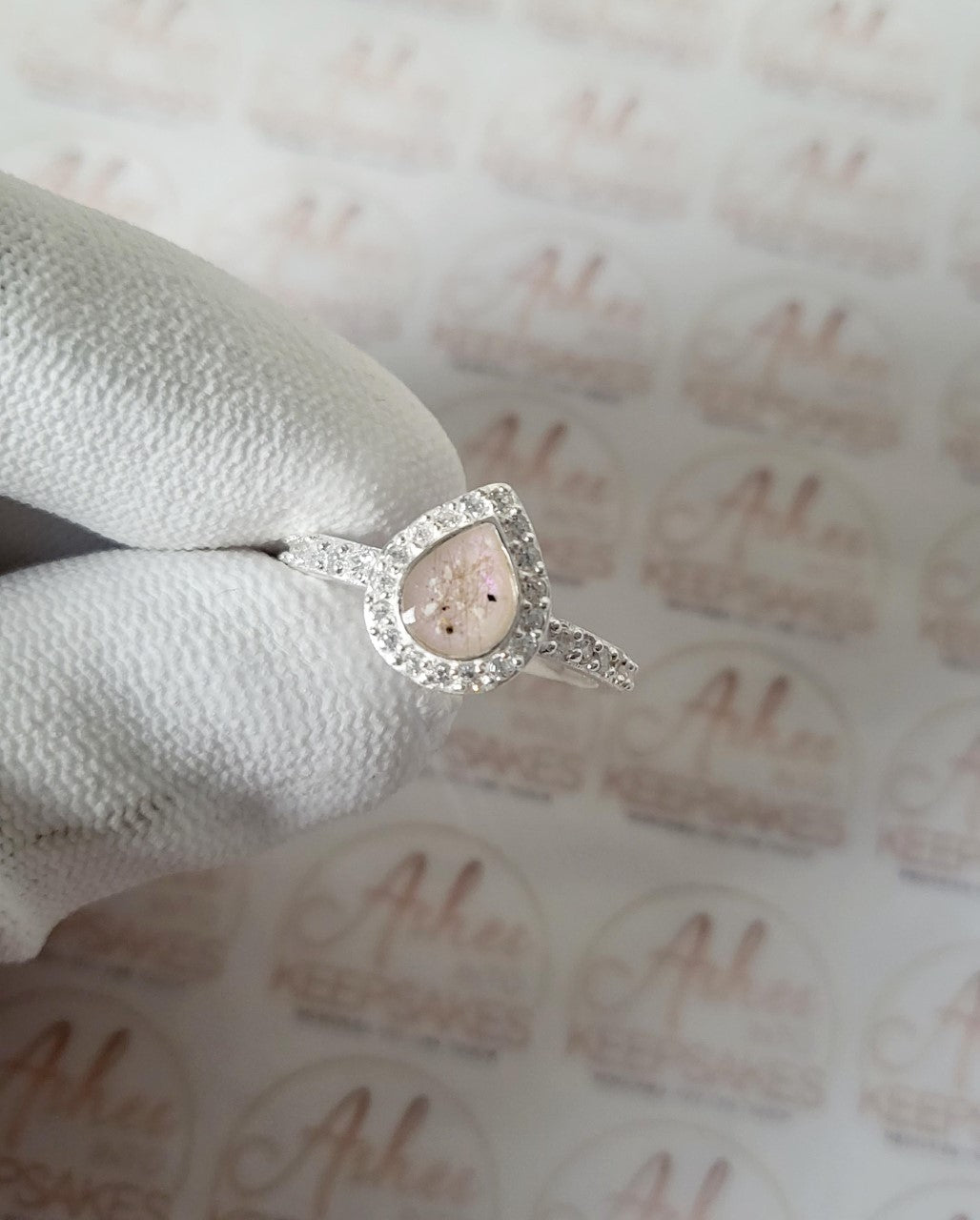 Sterling silver Sarah ring beautiful pear shaped stone encased with cubic zirconia's, lots of sparkle in this ring. This is for the ring only you can add the matching pendant and earrings for an extra cost. Comes in a choice of colours and can include your loved ones ashes, hair or pets fur. Add a touch of extra sparkle with the option of real diamond dust added to your jewellery, this is placed in between the layers of the stone and adds a subtle sparkle. Each ring is hand crafted to order and we estimate all orders to take around 3-5 weeks. All items come with authenticity certificate with your loved ones name on. Once you have placed and order with Ashes into keepsakes we will send out a pack for you to send your ashes, hair or pets fur back to us, any unused will be returned to you with your order. Please note if you are requesting a ring sizer, this could delay your order slightly whilst we are awaiting confirmation of your size.