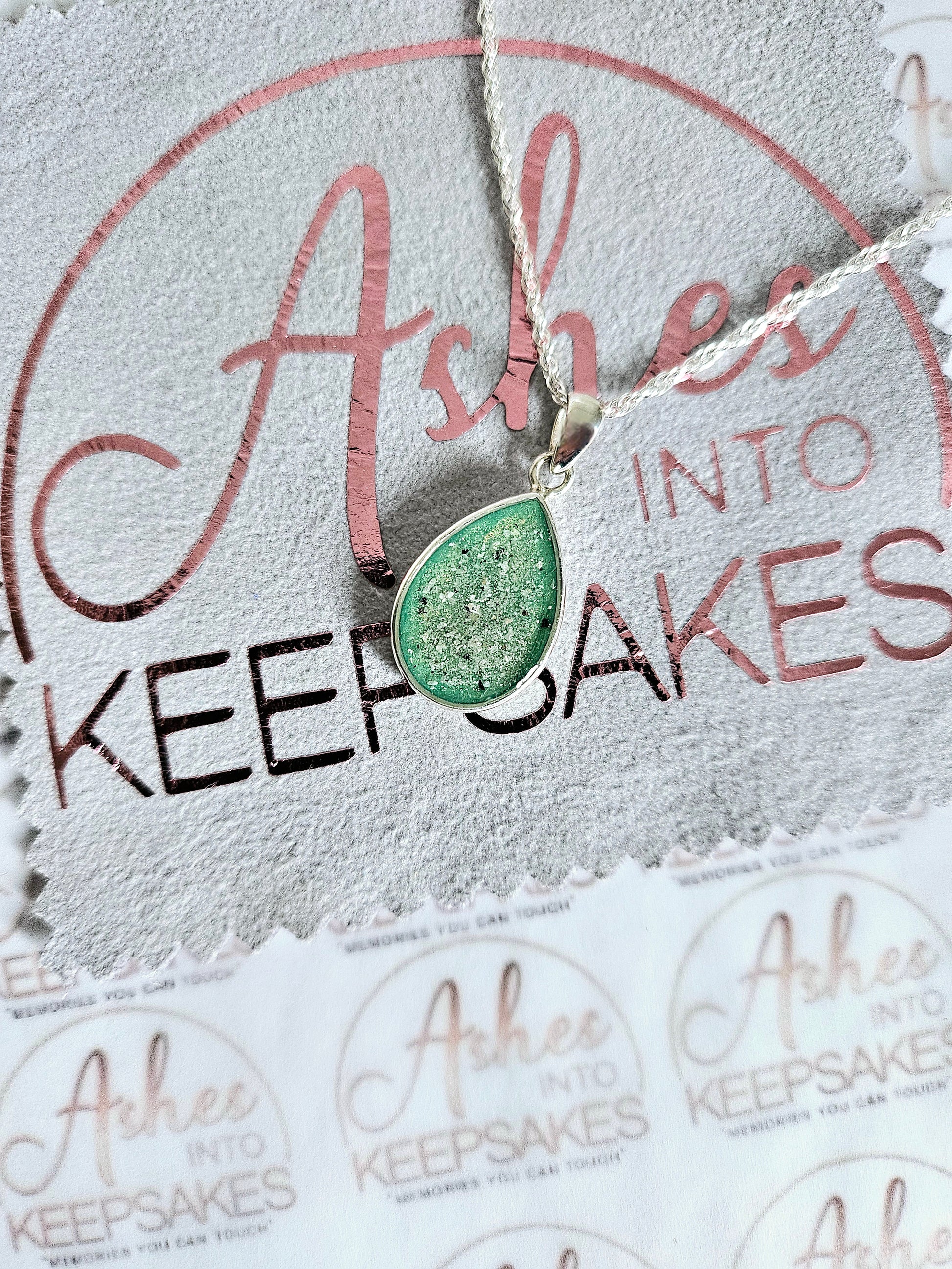 Beautiful memorial teardrop pendant for the inclusion of cremation ashes hair or pets fur, made in as little as 7 days with our speedy service option. Sterling silver teardrop pendant. Approx 16x11mm. Comes in a choice of colours and can include your loved ones ashes, hair or pets fur. Add a touch of extra sparkle with the option of real diamond dust added to your jewellery, this is placed in between the layers of the stone and adds a subtle sparkle. Each pendant is hand crafted to order and we estimate all orders to take around 3-5 weeks. All items come with authenticity certificate with your loved ones name on. Once you have placed and order with Ashes into keepsakes we will send out a pack for you to send your ashes, hair or pets fur back to us, any unused will be returned to you with your order. The completed product will be expertly buffed to create a mirror shine finish, and due to the range of colours we have to choose from no two resin gems are ever the same. Ashes into keepsakes is committed to each one of our customers to provide the best service and care. Your loved ones ashes, hair or even pets fur will be handled with the utmost respect and care, and any unused will be sealed and returned to you with your order. Your orders will be sent to you with a special authenticity certificate with your loved ones name on and the creation date, then hand signed by our designer. To take care of your resin inlaid product, do not expose it to extreme temperatures, if this happens at any point we advise to just leave it sit at room temperature for a small amount of time. We advise to remove when showering, swimming or handling cleaning products. Make sure to not store in direct sunlight. The rings shine can be restored using a branded resin polish, any damage after you have received your jewellery we accept no liability for this, please read on how to care for your jewellery ensuring it lasts a lifetime. We offer a no refunds policy, this is because once your order is placed any jewellery will begin being produced ready for when your inclusion arrives to us. Speedy service is available at the checkout this guarantees your order for a specific date, this needs to be agreed before adding to cart please email us.